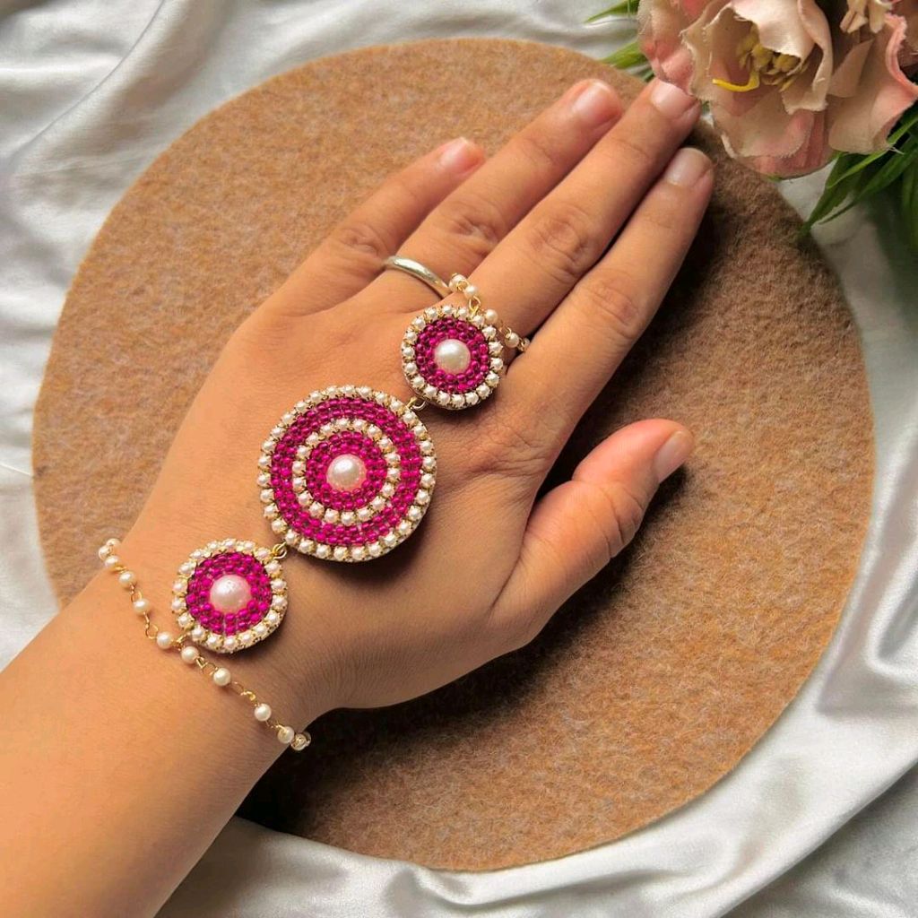 Let your hands speak elegance — wear the charm of pearls with the Pearl Hathphool.
